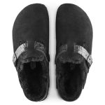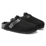 Our classic Boston silhouette gets an elevated yet cozy make over. The upper features our super soft suede complimented by a tonal reptile embossed strap, while the footbed exterior is wrapped in premium smooth black leather for added elegance. Both the upper and the footbed are fully lined in genuine shearling creating both a cozy and fashionable look.